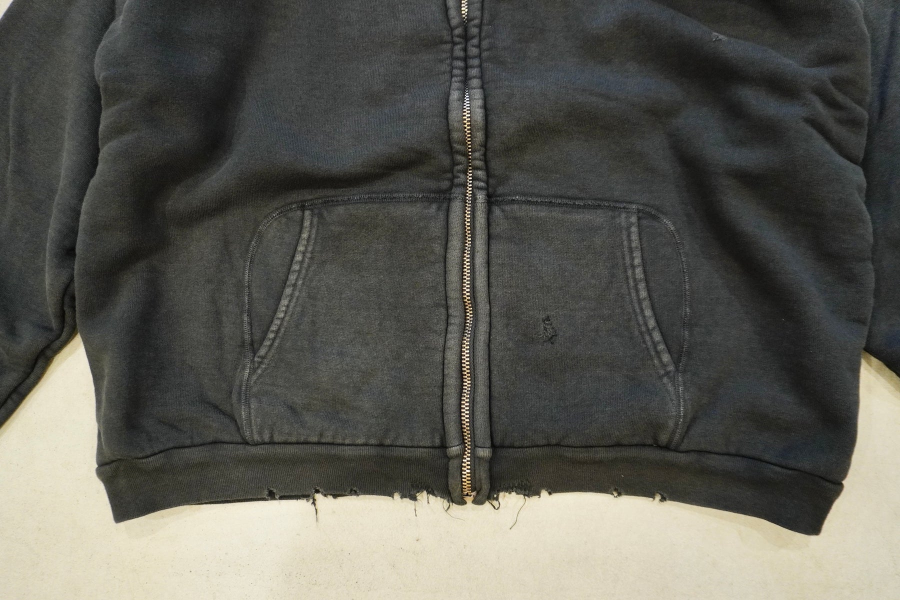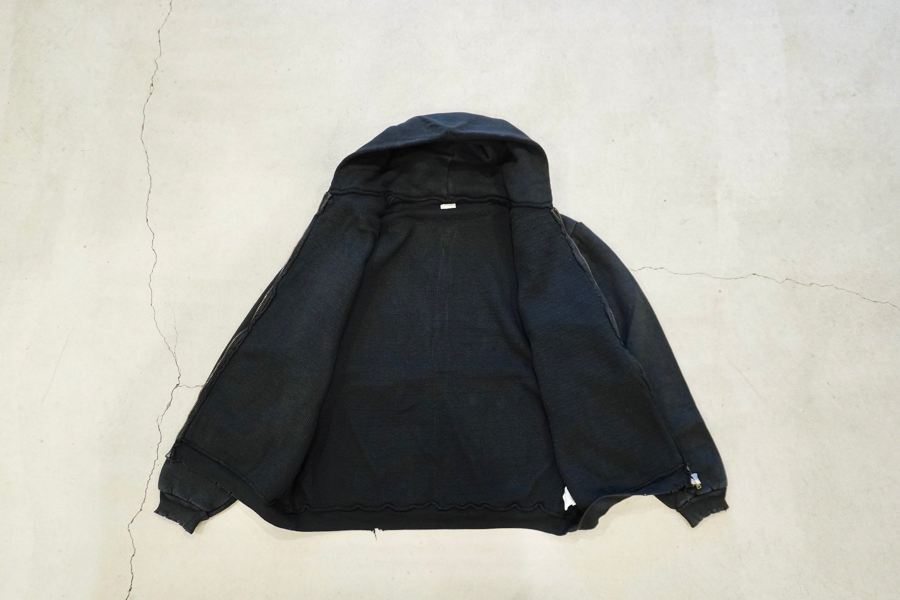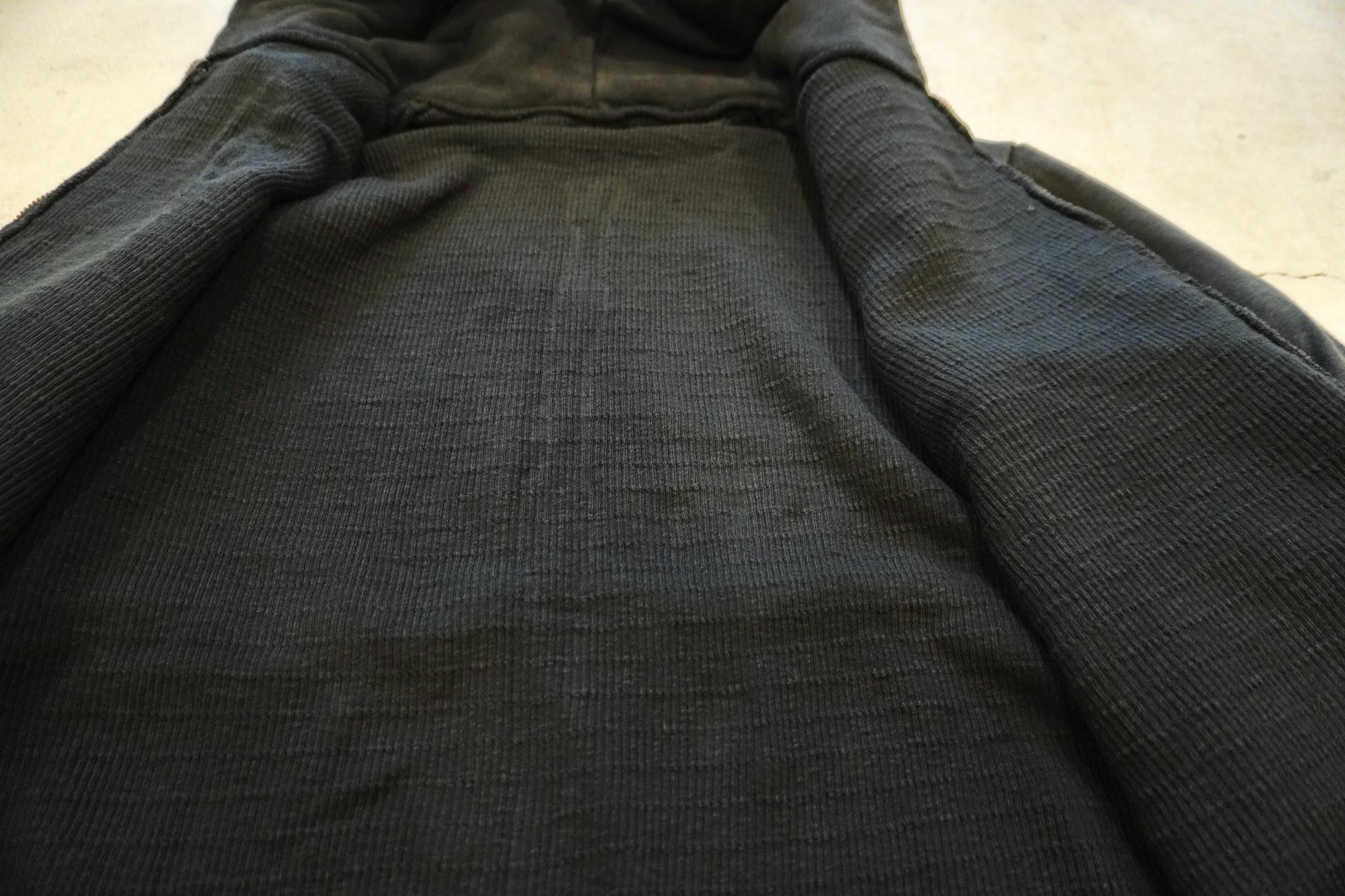 【素材】表地はヴィンテージを解析して作った吊り裏毛、1時間に1メートルというゆっくりとしたスピードでしか編み立てられないが、糸に余計な負荷を掛けないで編み上げることで、肉厚ながら固くならず、ふっくらとした風合いで仕上げた