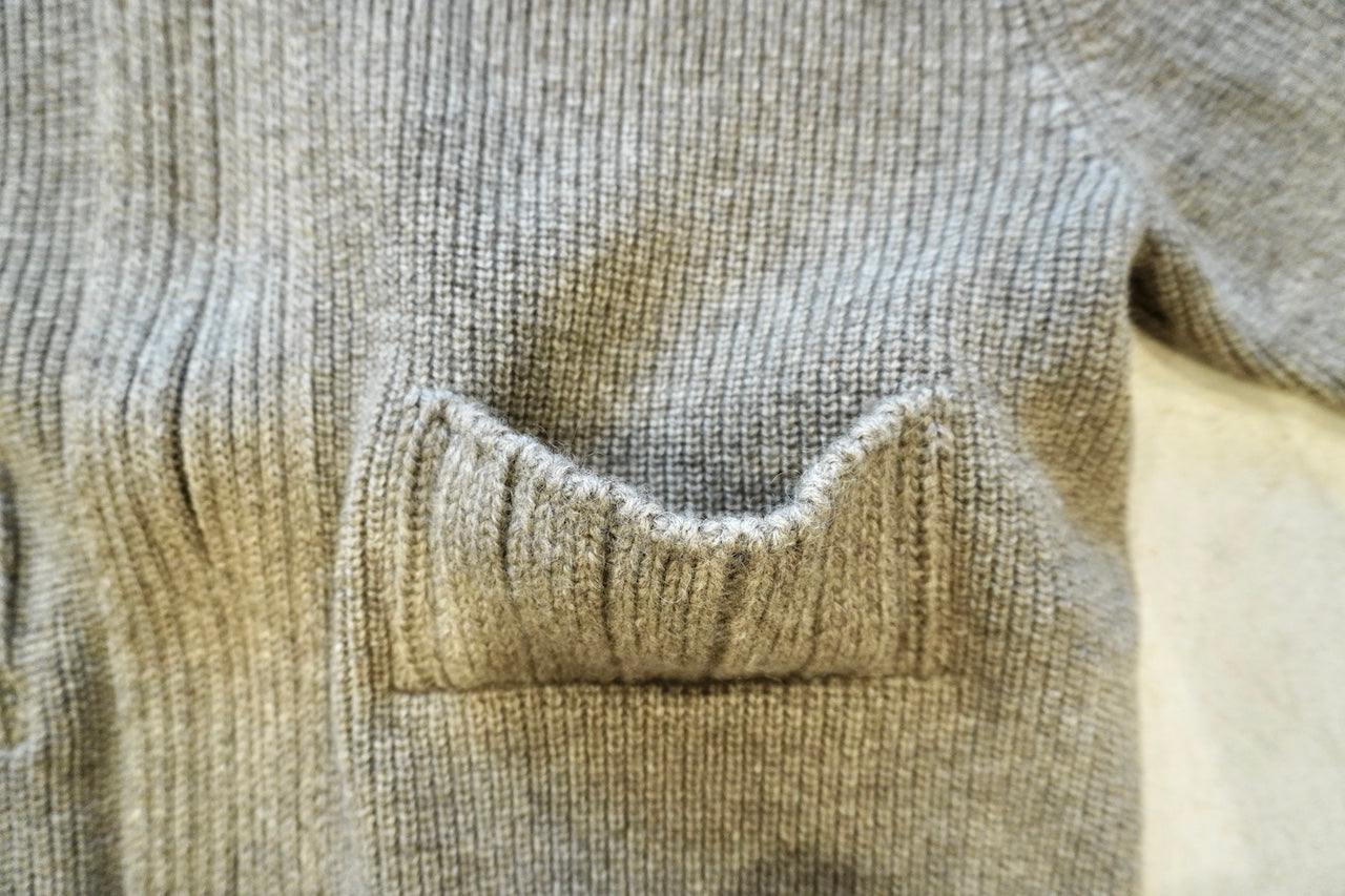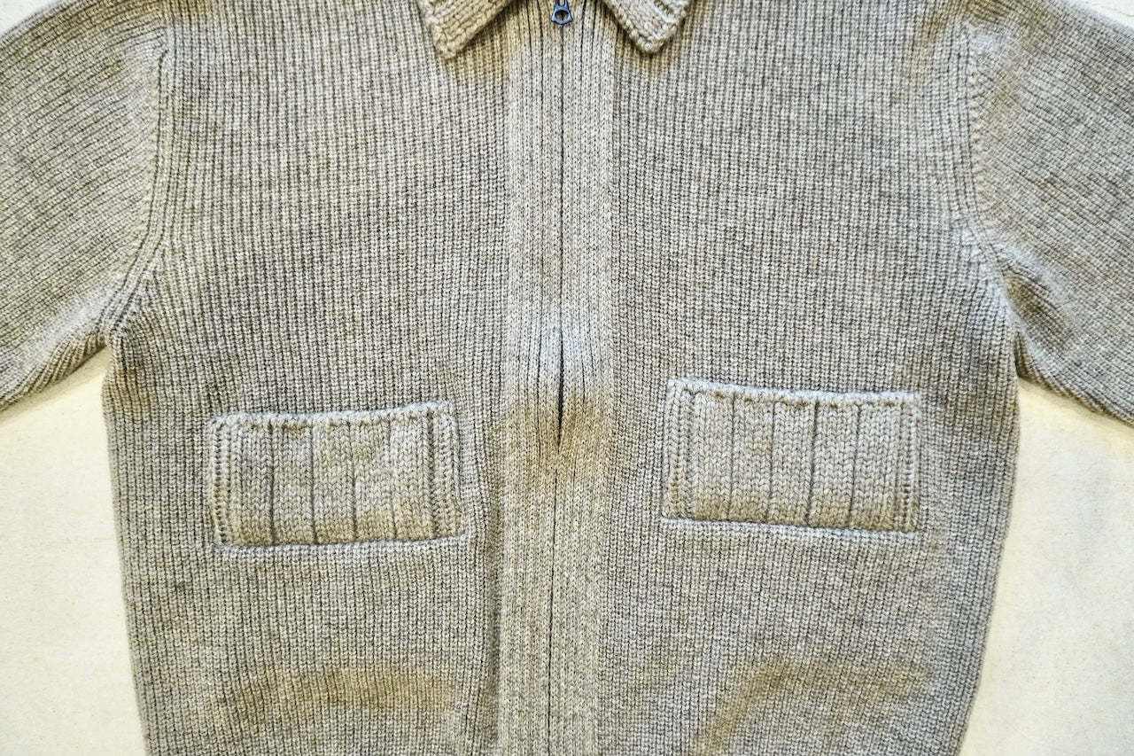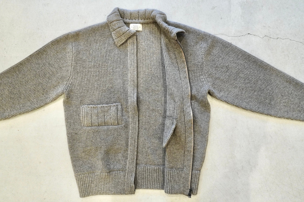 フライトジャケットをニットで作ったらというイメージで、両サイドにある太幅リブのポケット位置を高めにしてアンバランスさを出したデザインに。