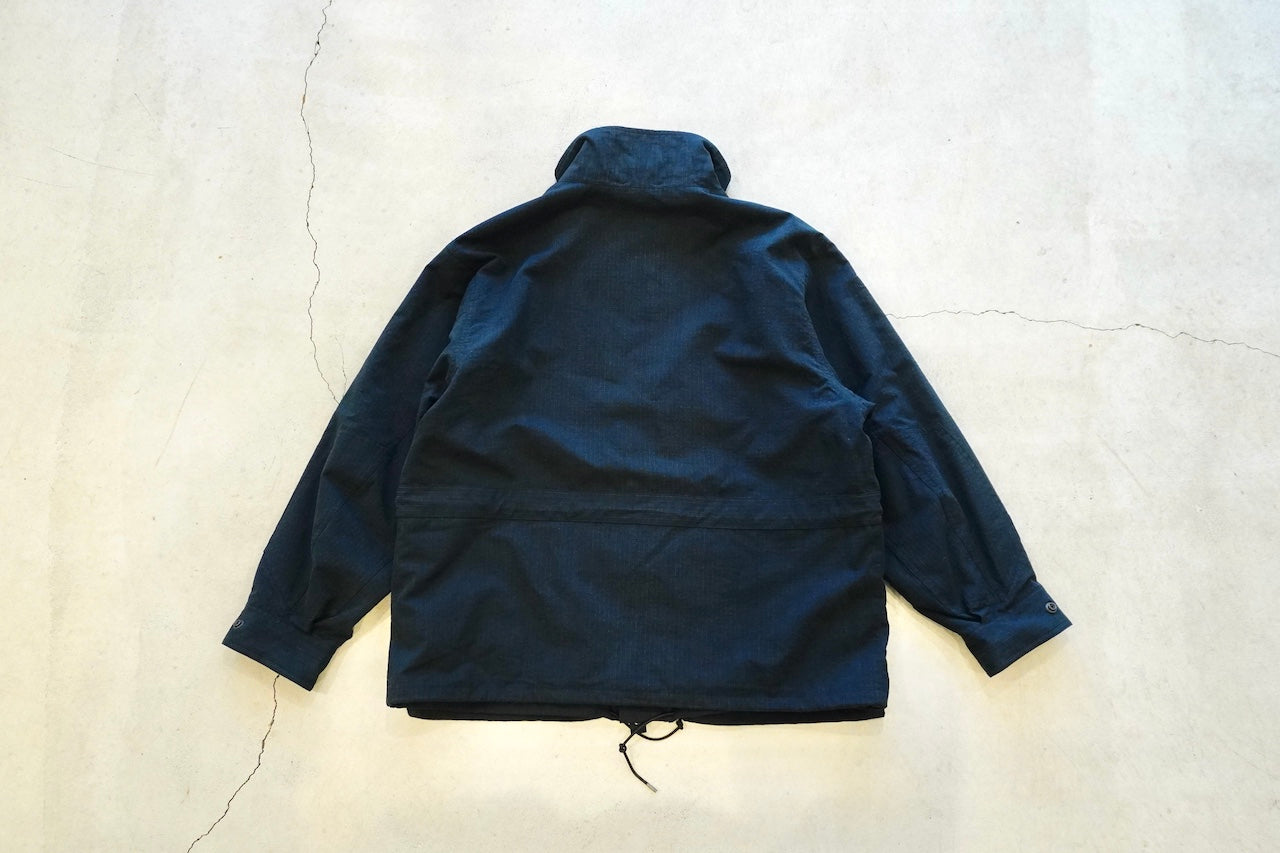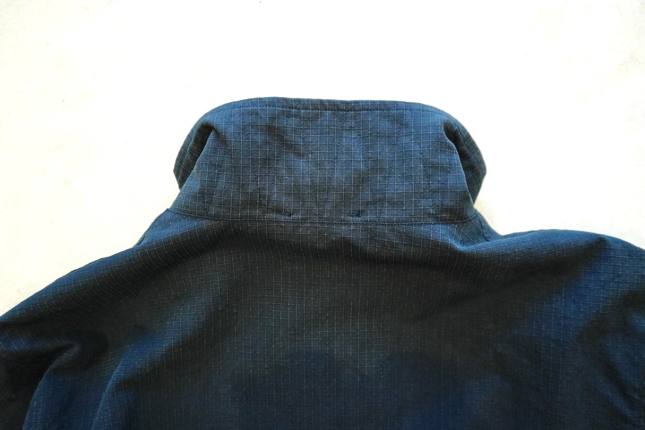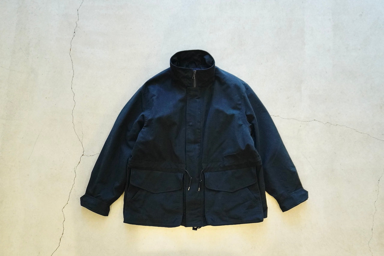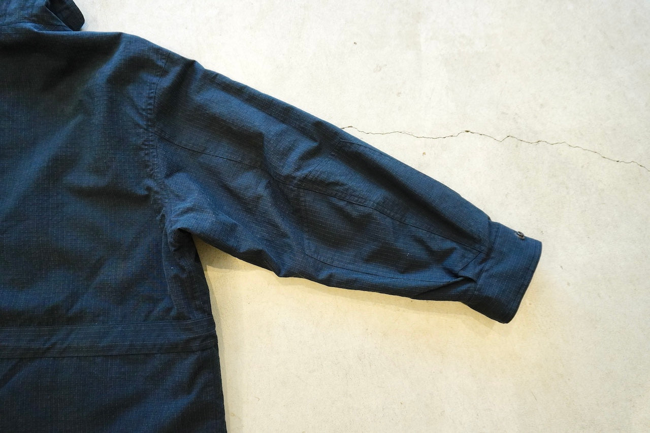 原型から胸ポケット、前肩ヨーク、アームポケットを排除することで着易くアレンジし肩傾斜もつけることで着心地も良化し、程良いオーバーサイジングなボックスシルエットでパッカブル仕様