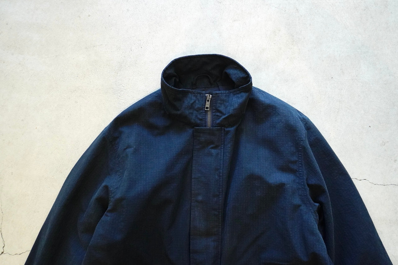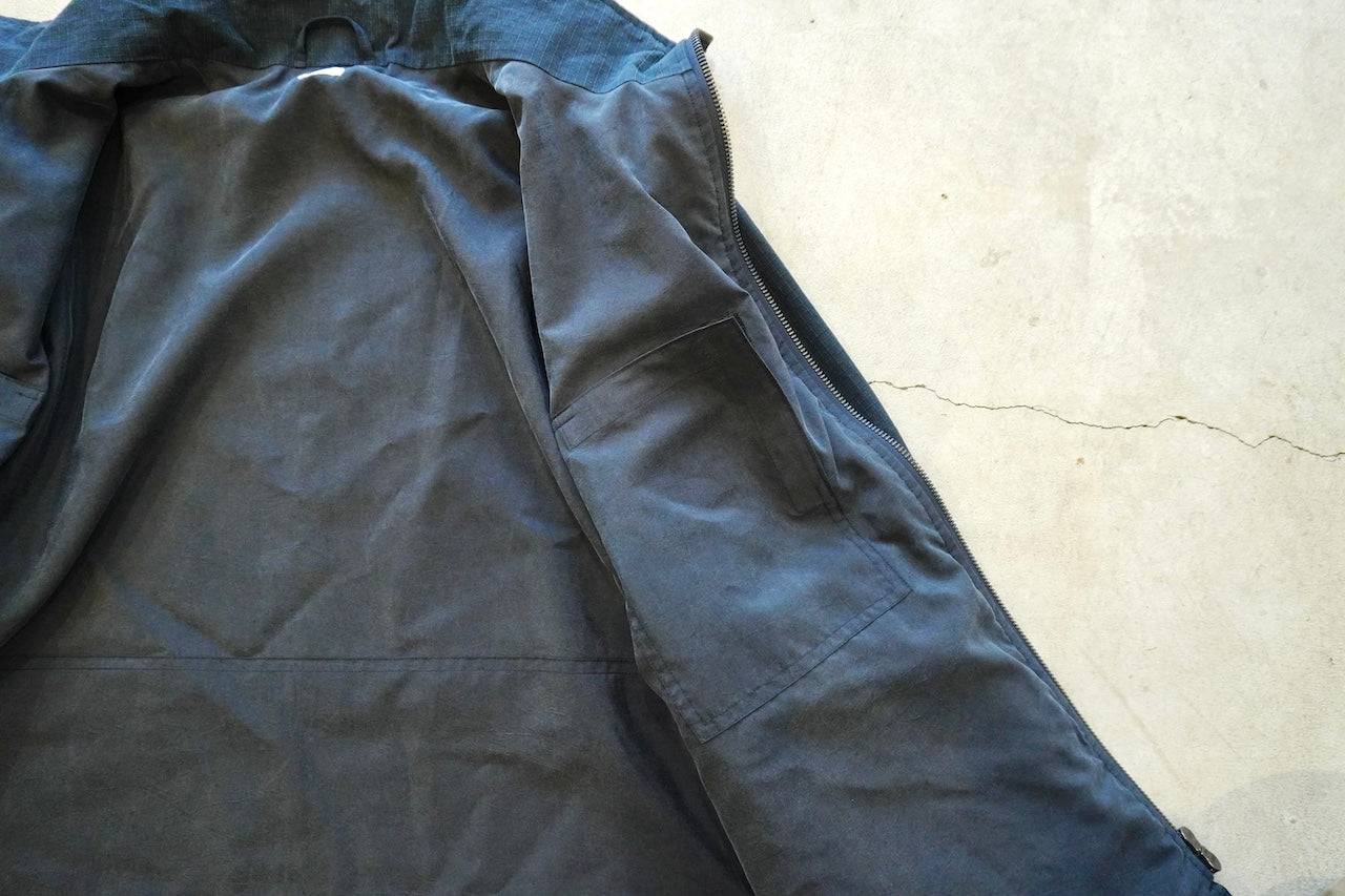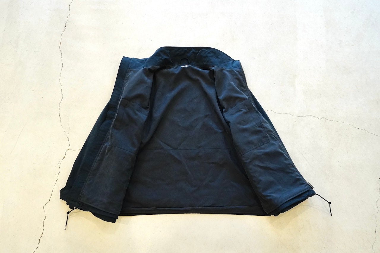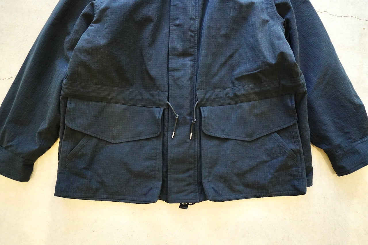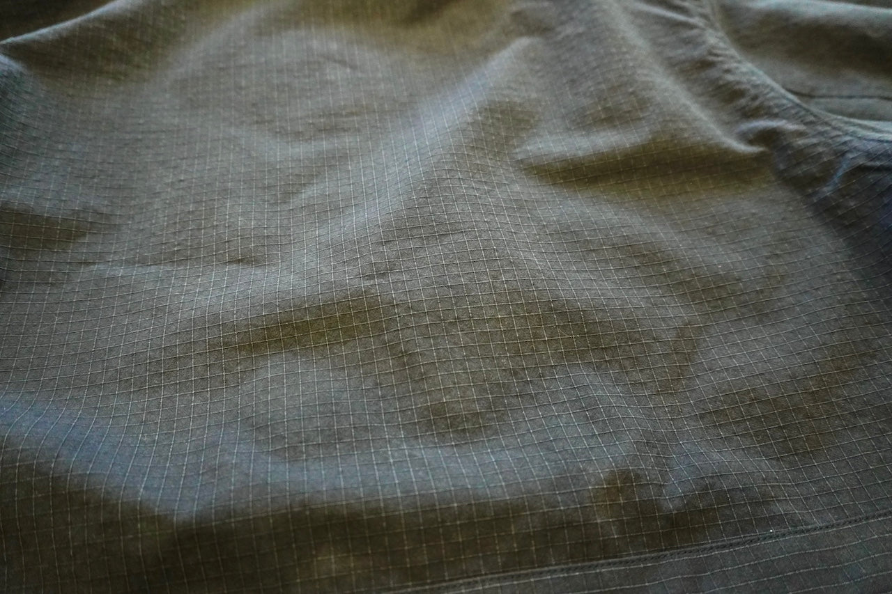 原型から胸ポケット、前肩ヨーク、アームポケットを排除することで着易くアレンジし肩傾斜もつけることで着心地も良化し、程良いオーバーサイジングなボックスシルエットでパッカブル仕様