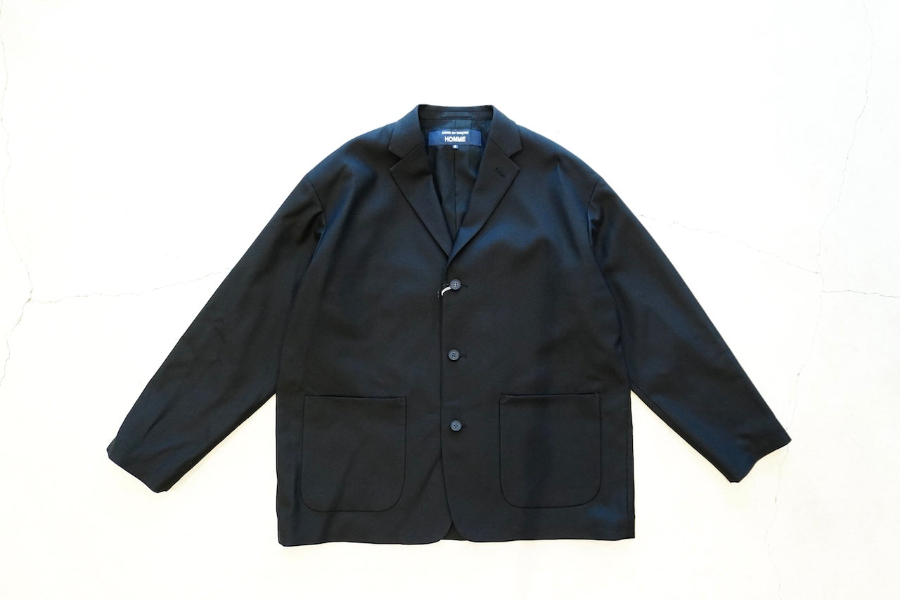 3ボタン仕様のオーセンティックなジャケットはCOMME des GARCONS HOMMEならではのシルエットにこだわったブランドらしい一枚。素材には目が細かく触り心地が良いウールギャバジンを生地に使用し、シルエットには肩パットの入らないアンコン仕様とウエストに絞りが入らないカジュアルなデザインで仕立てられており、ウール素材ならではの上品さとラフさを兼ね備えた一枚に。ウールパンツと合わせてカチッとした装いも、デニムやカーゴパンツなどと合わせカジュアルにも。普段着使い出来るデザインが魅力となったジャャケットです。