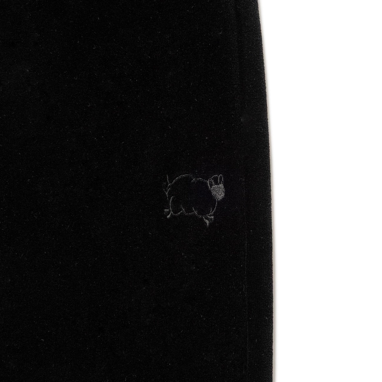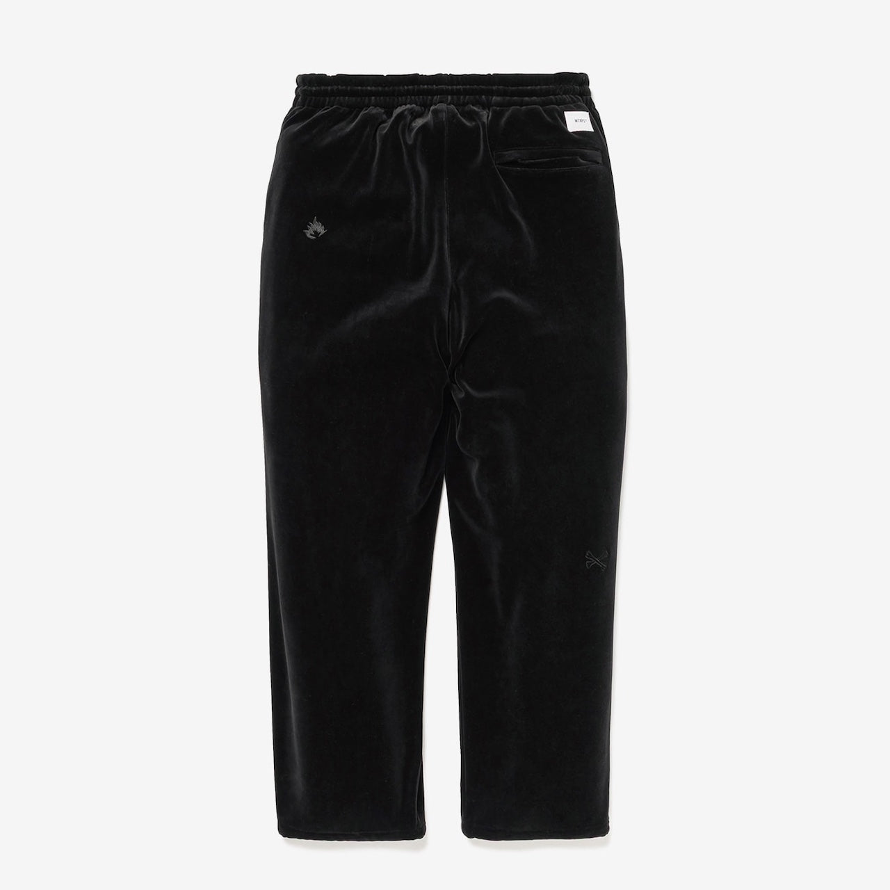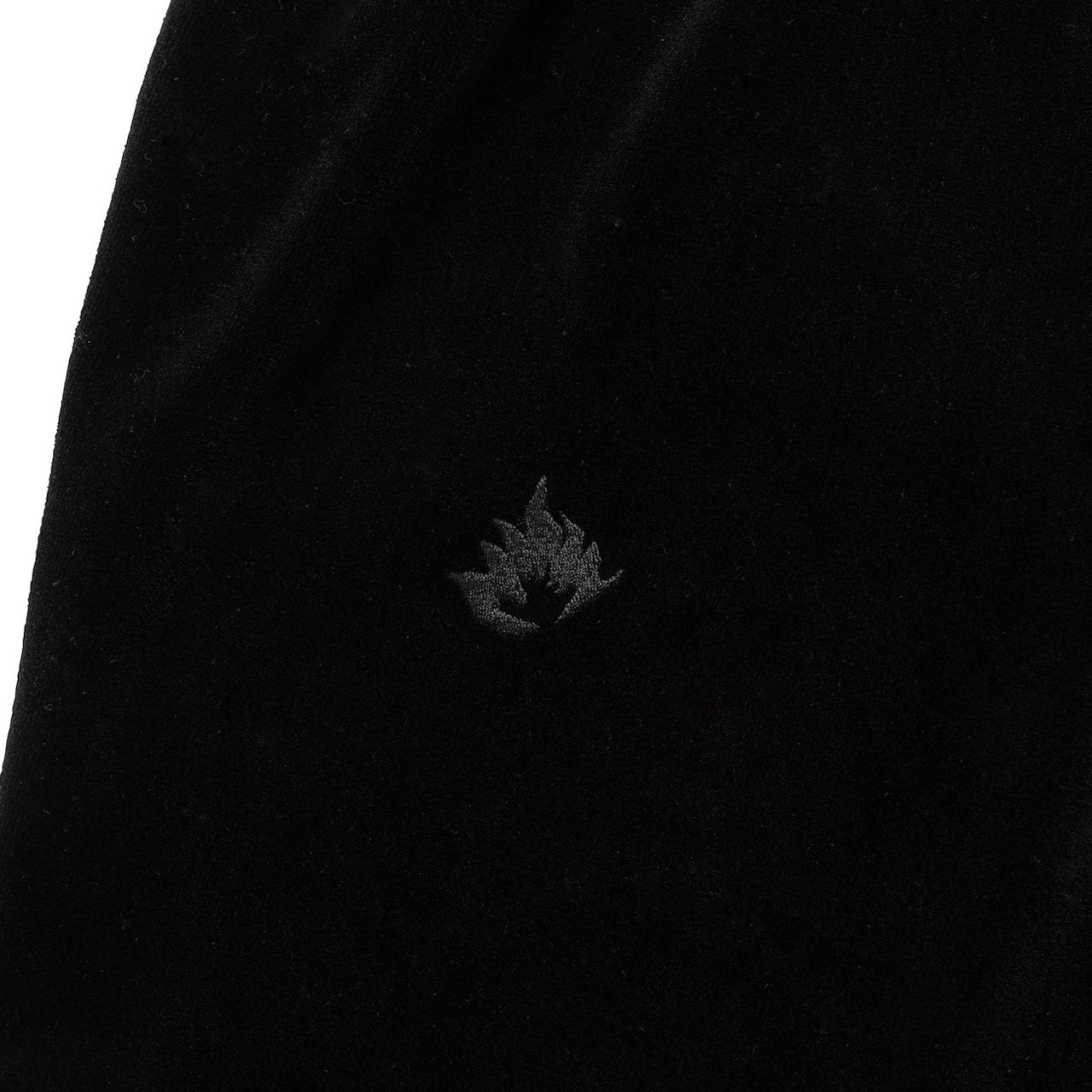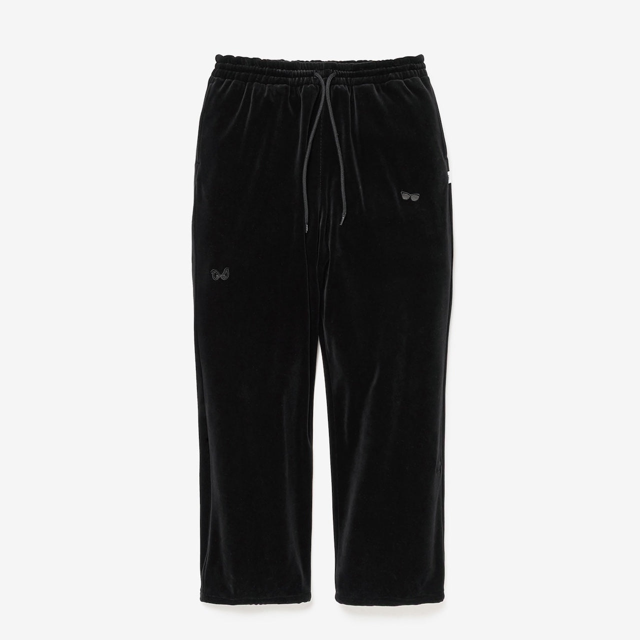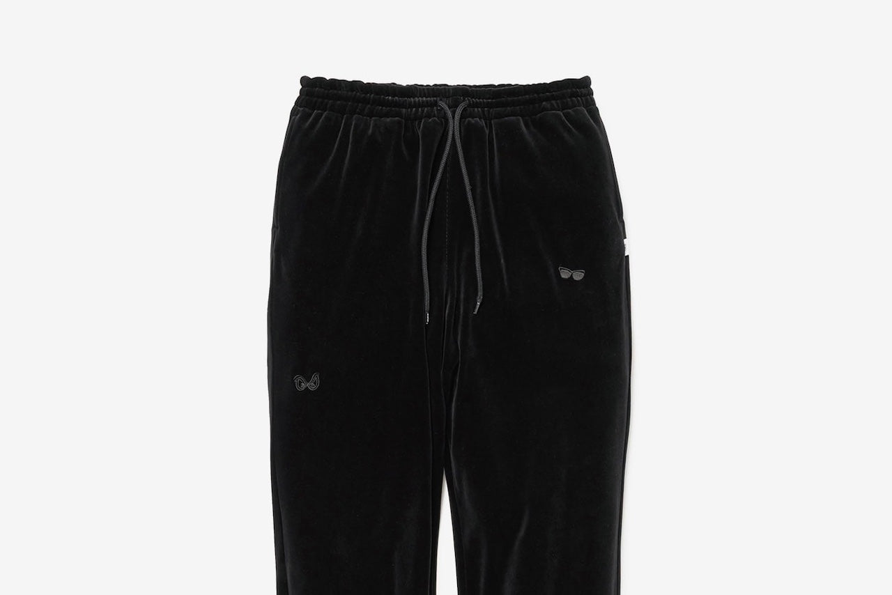 コシのあるベロア生地を使用したトラックパンツ。ウエストは内蔵したエラスティックとスピンドルシステムで、裾はスピンドルシステムで調節可能。全面に刺繍モチーフを配置。