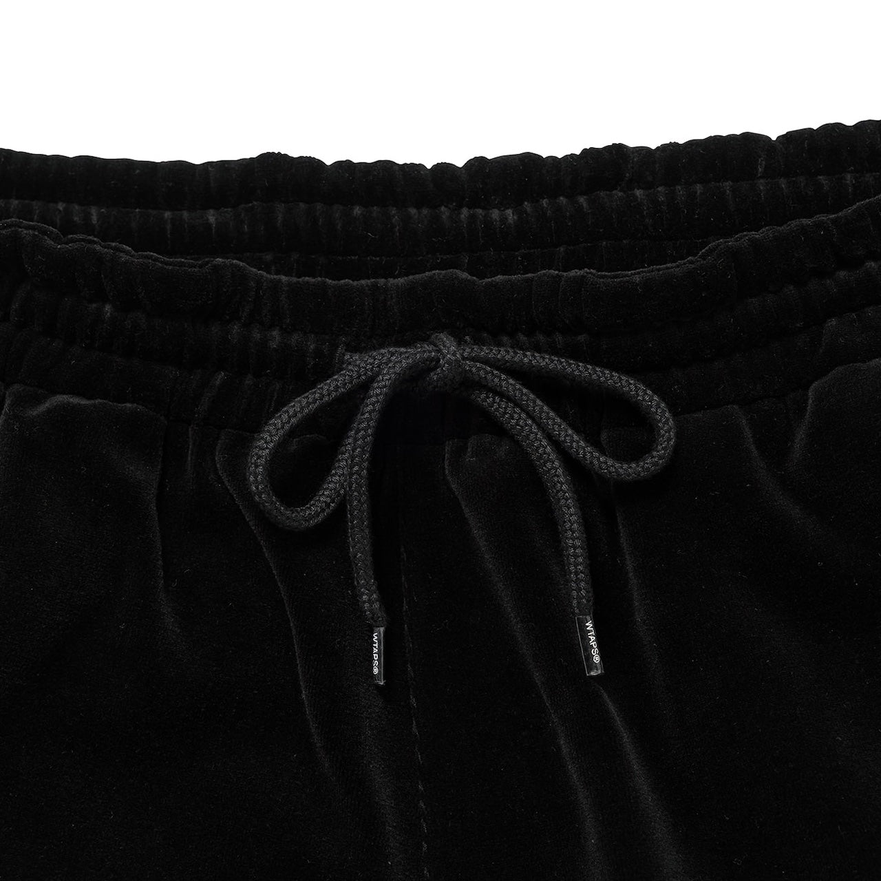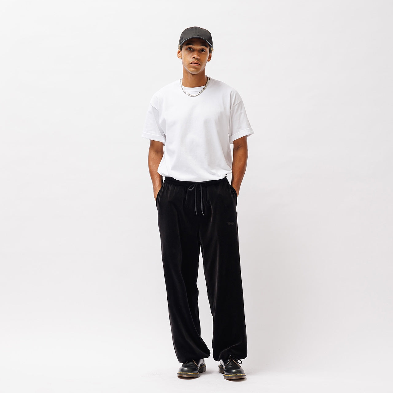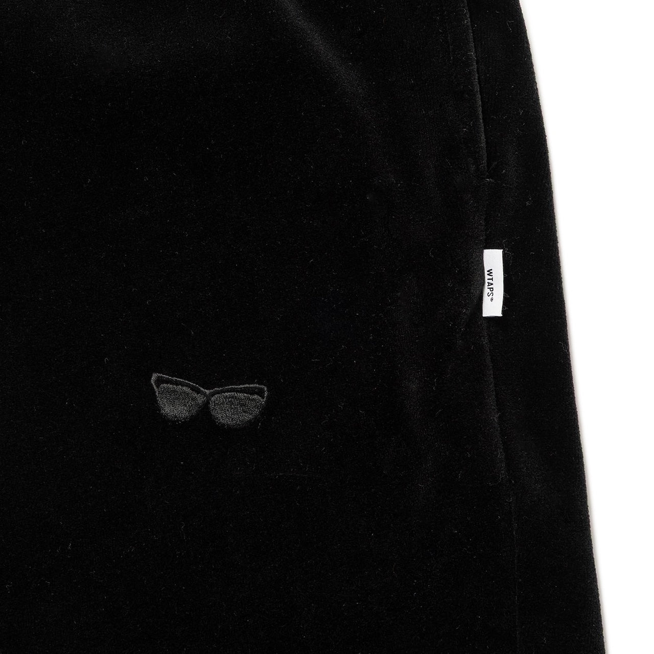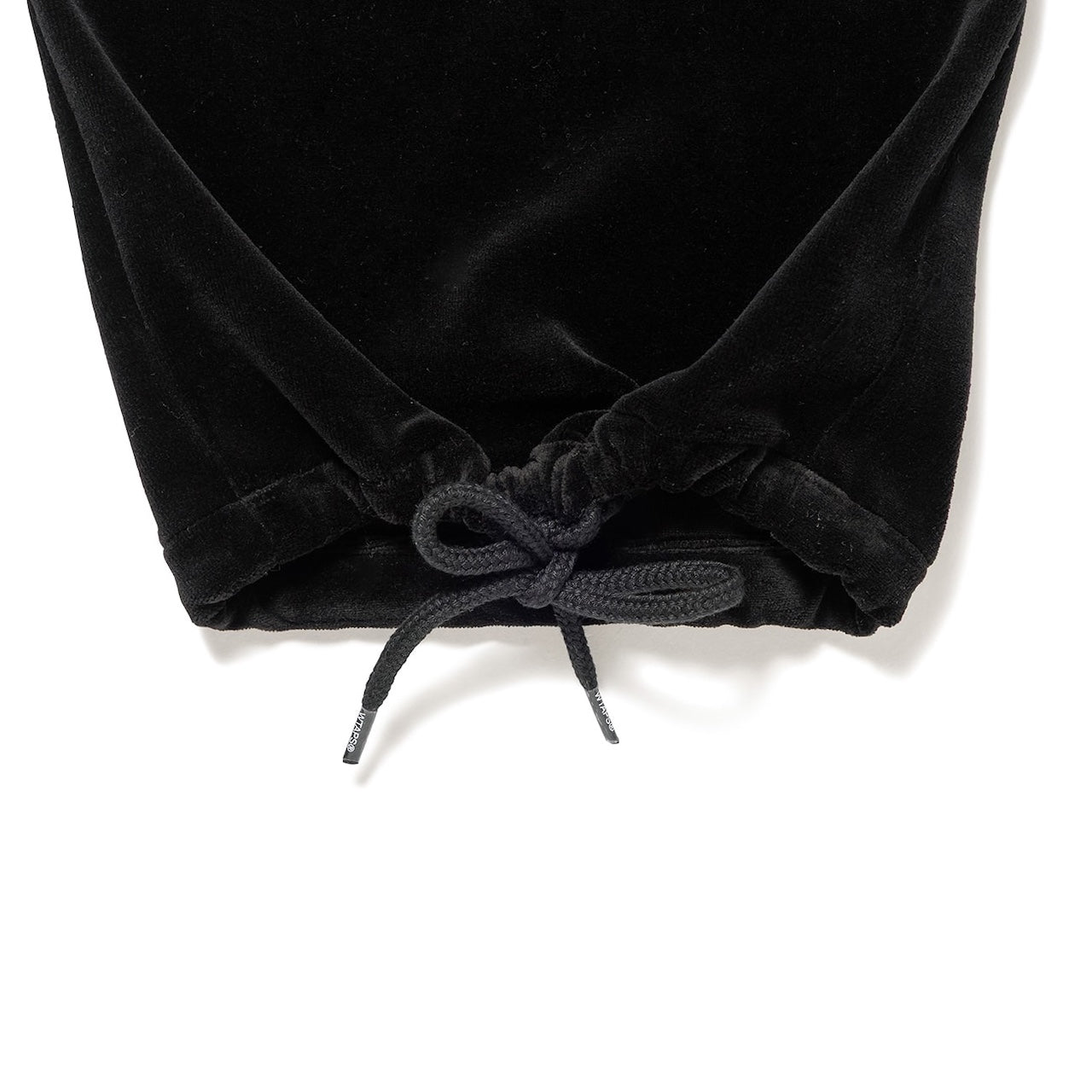 コシのあるベロア生地を使用したトラックパンツ。ウエストは内蔵したエラスティックとスピンドルシステムで、裾はスピンドルシステムで調節可能。全面に刺繍モチーフを配置。