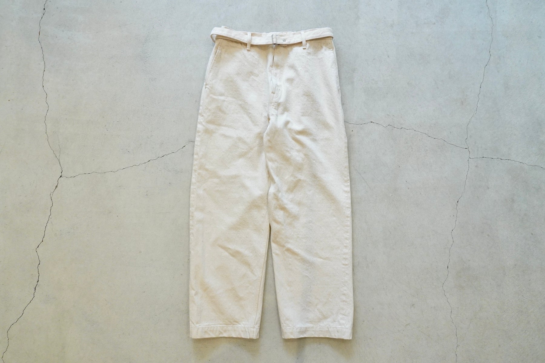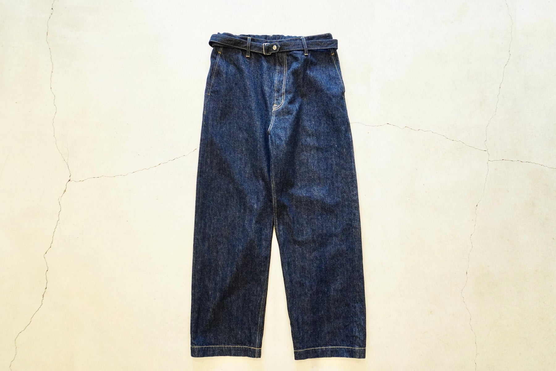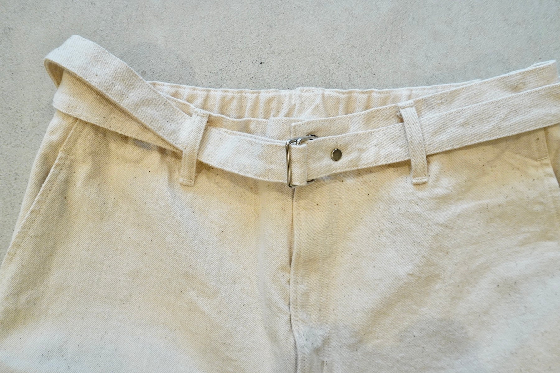 リラックス感のある、ワイドなストレートシルエットが特徴。共生地で製作したロングベルトがセットで付いたユニークなルックス。