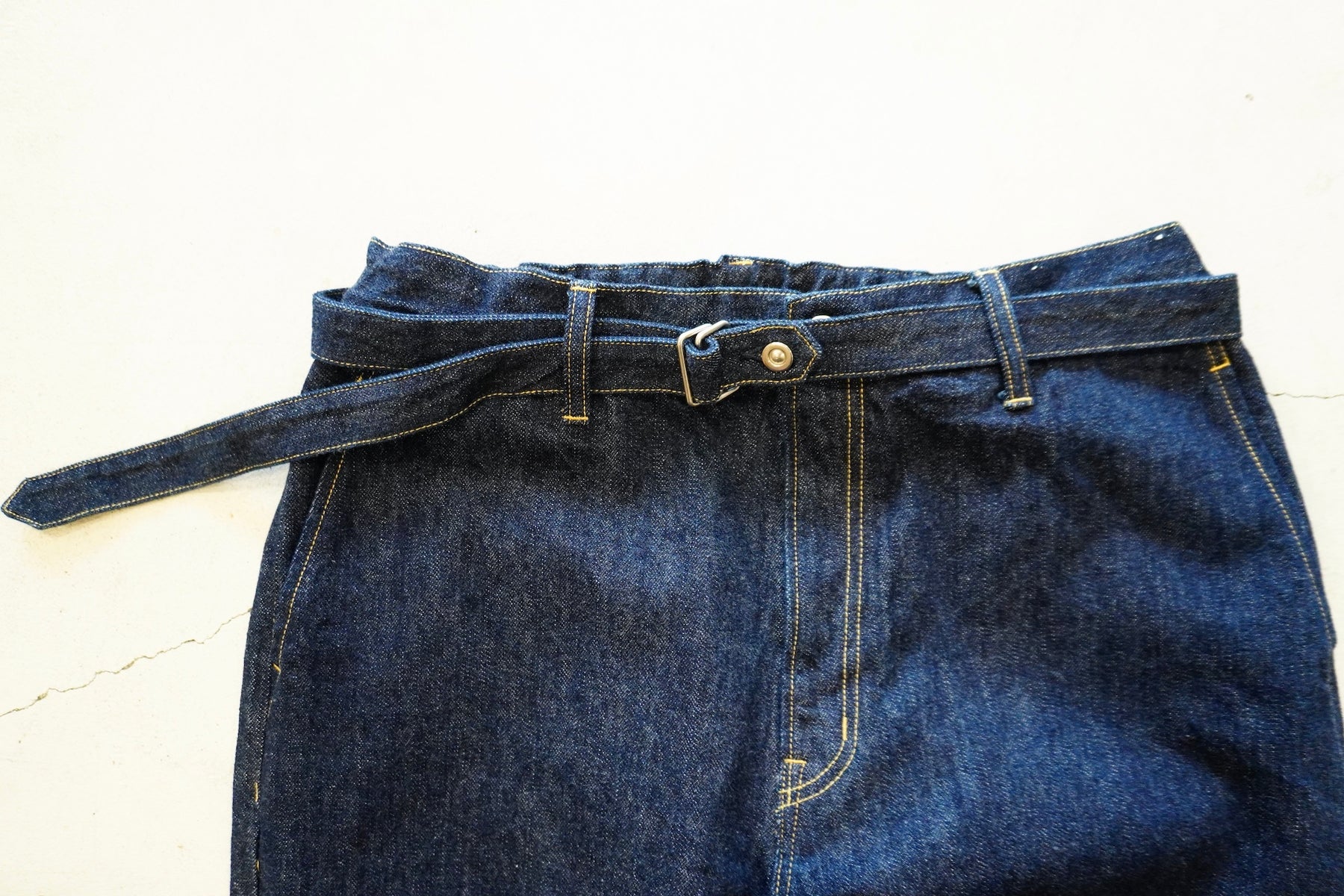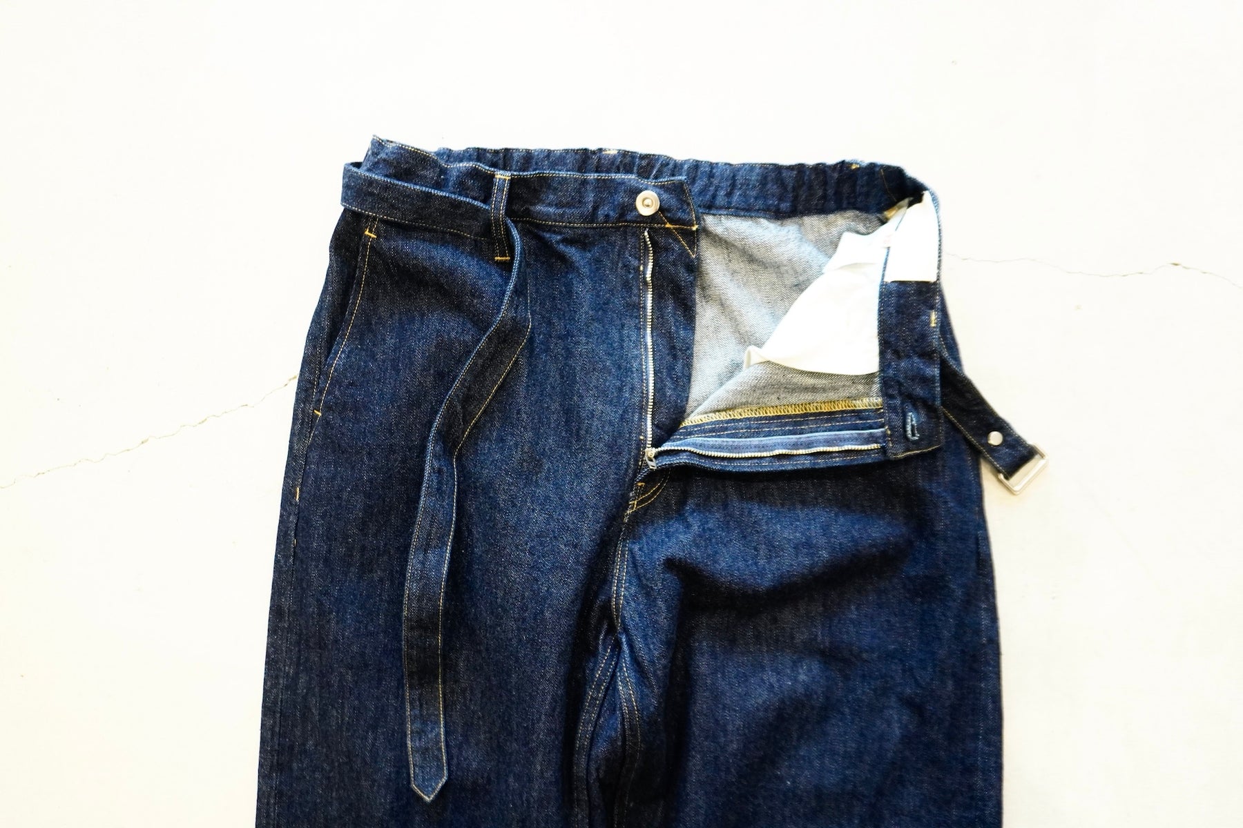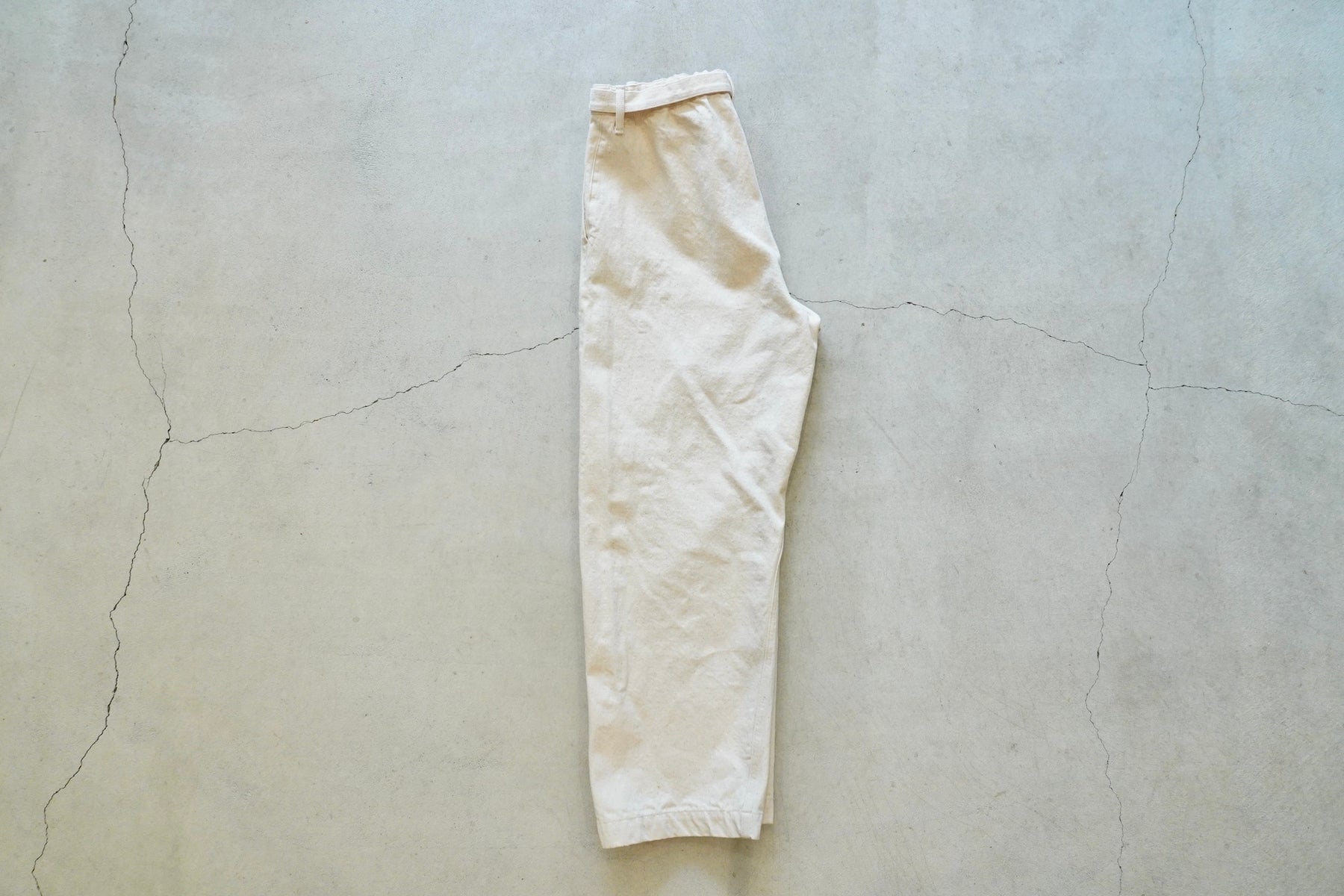 リラックス感のある、ワイドなストレートシルエットが特徴。共生地で製作したロングベルトがセットで付いたユニークなルックス。