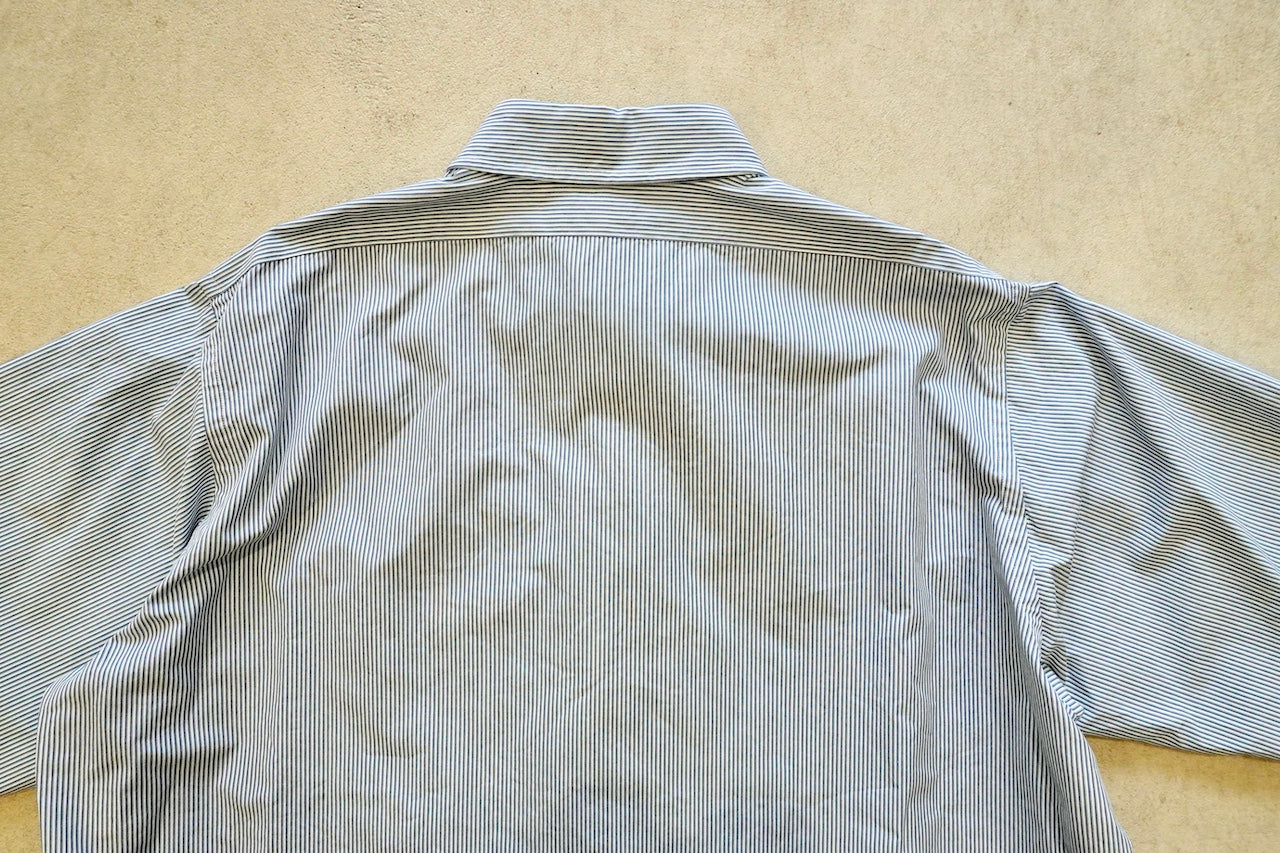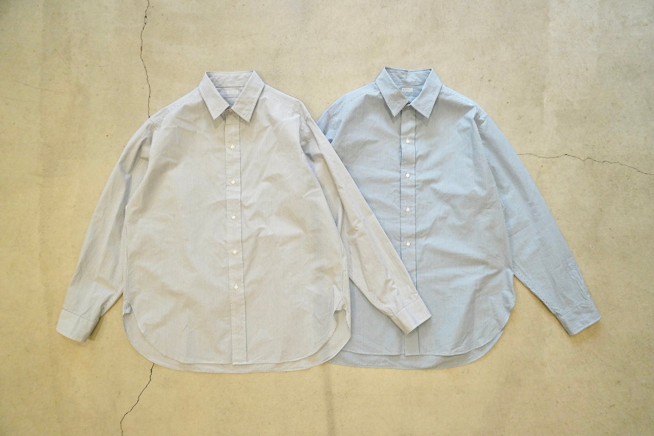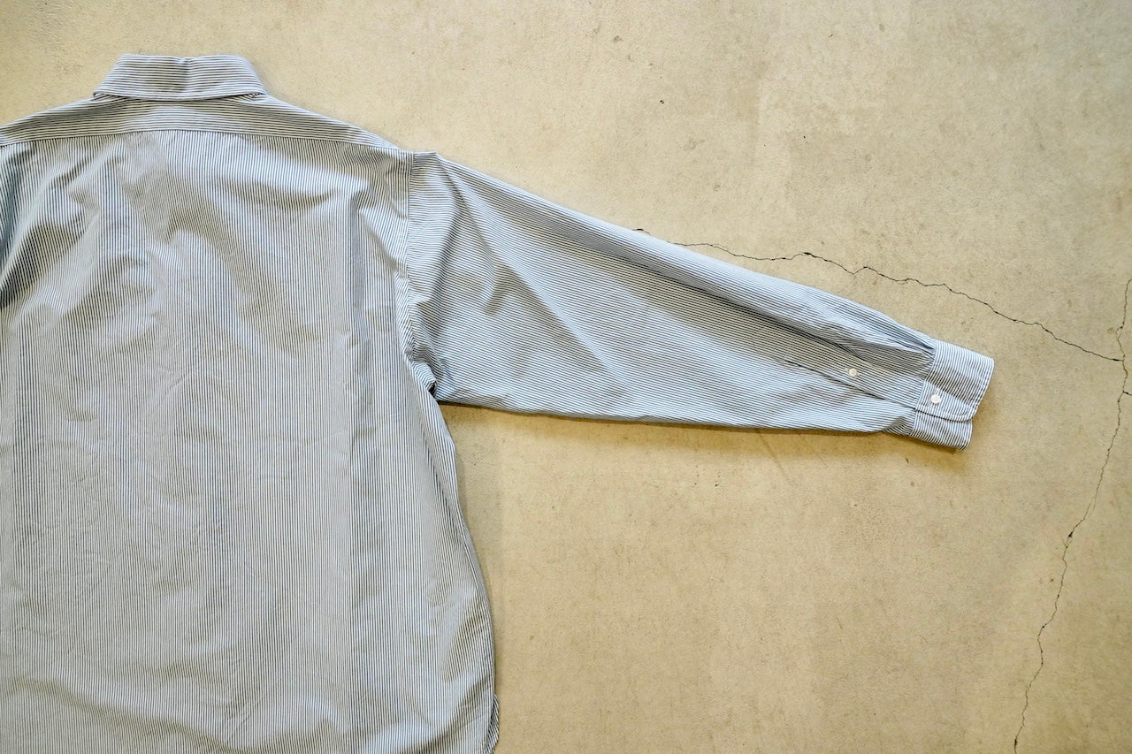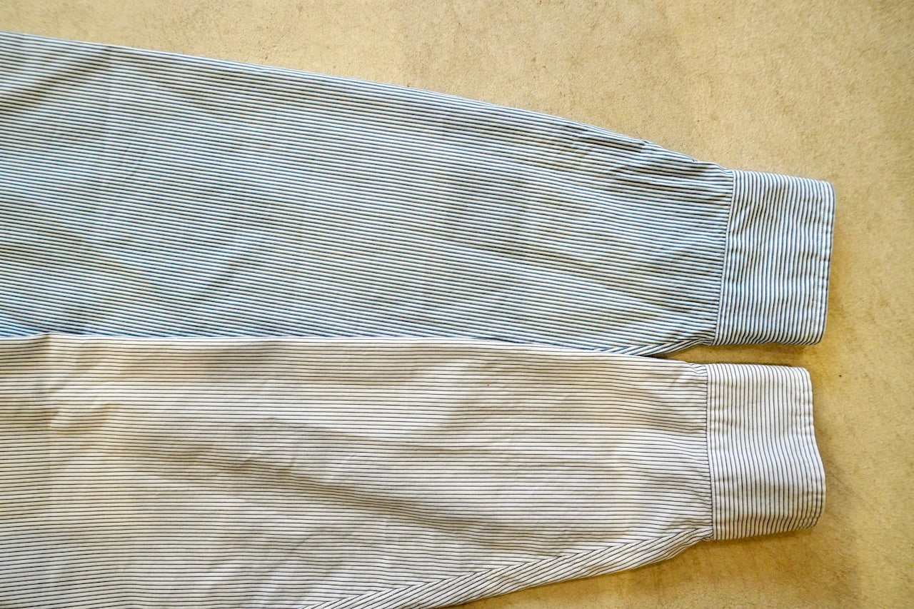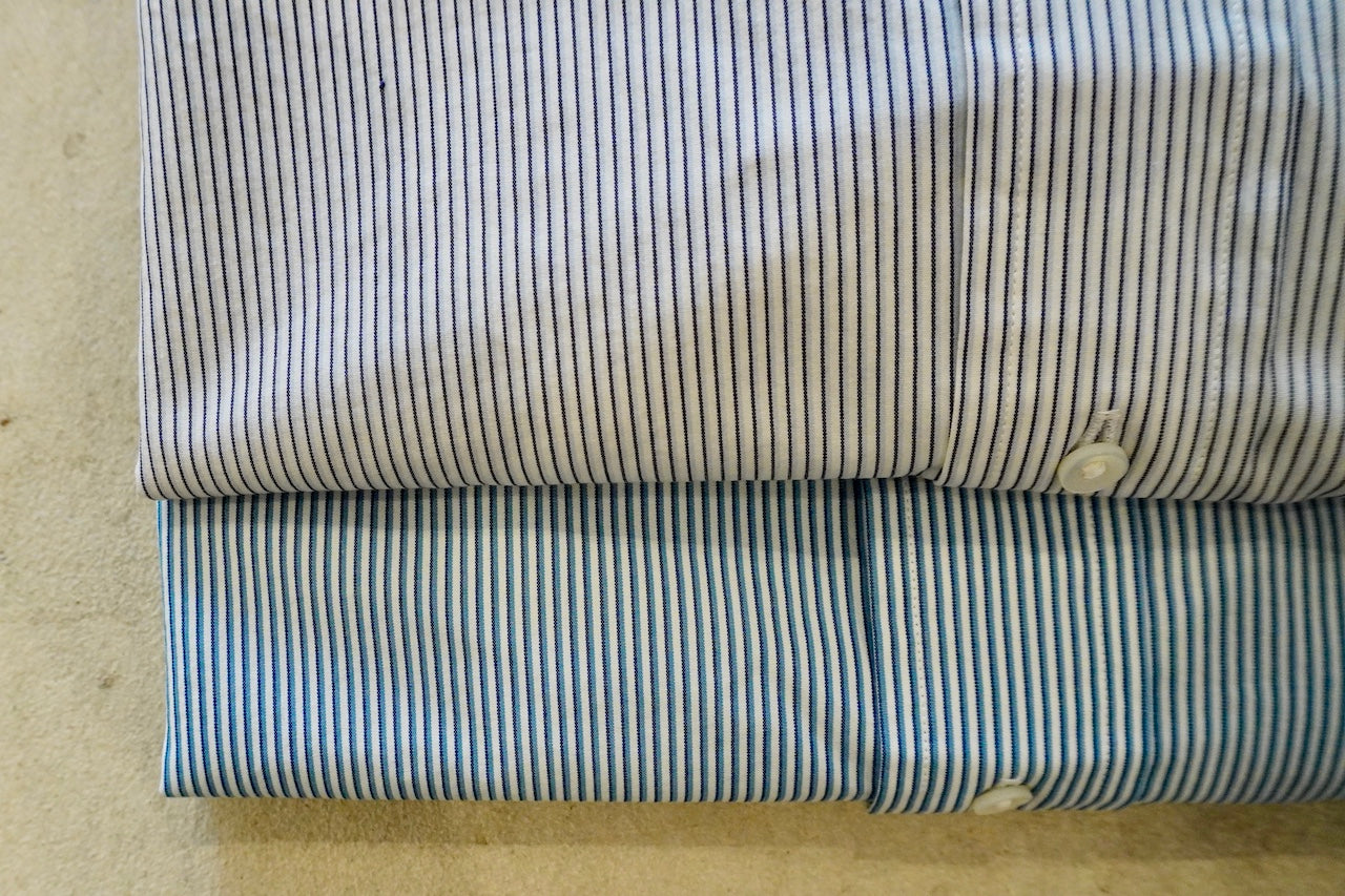 【素材】経糸は細番手のギザコットン、緯糸は細番手のスーピマコットンと、経緯ともに細番手の超長綿糸を使用して、高密度に織り上げたマイクロストライプ