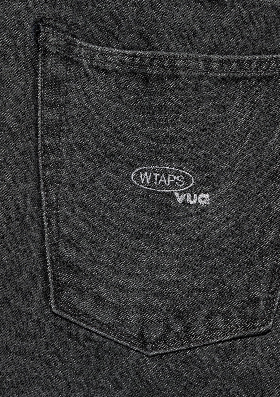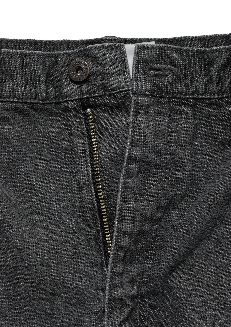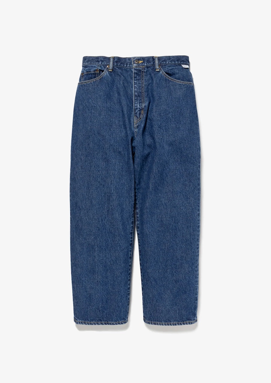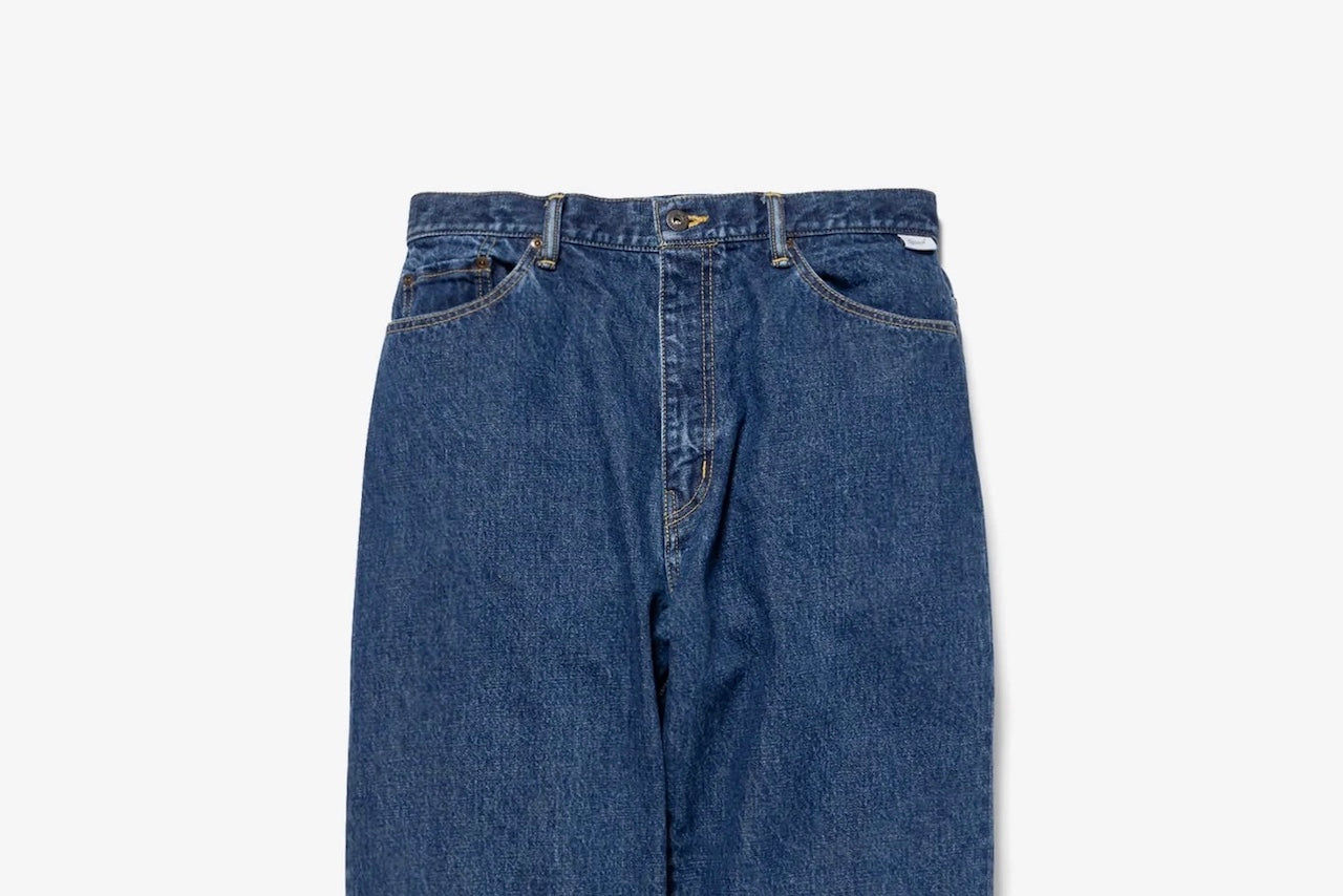 ストーンバイオブリーチ加工を施した14ozデニムのストレートジーンズ。股上の深いワイドシルエット。左バックポケットに刺繍モチーフを配置。