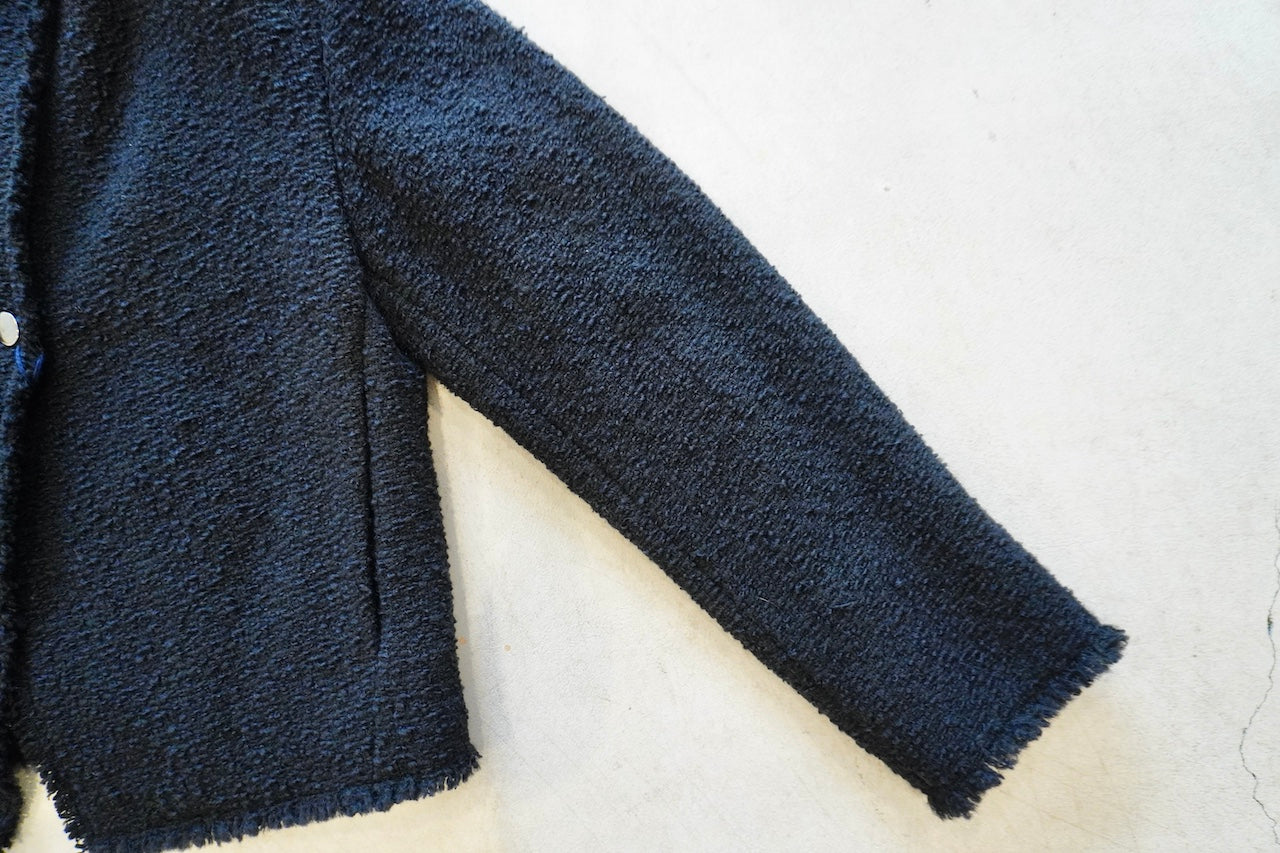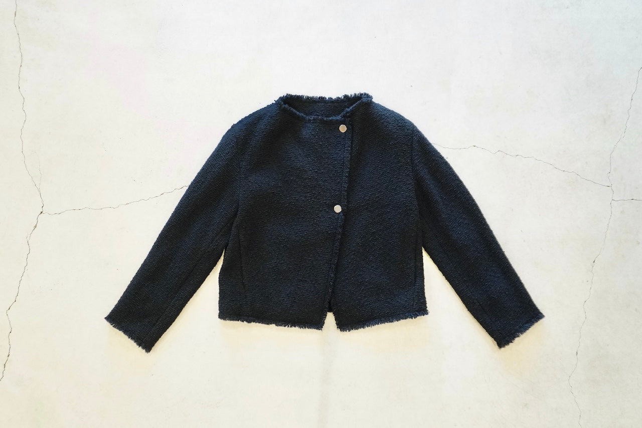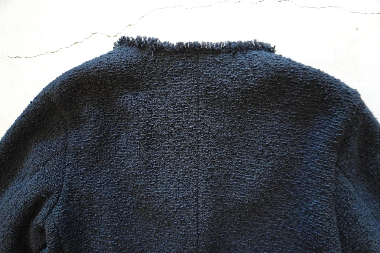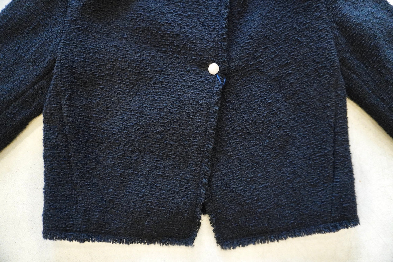 イタリアのプラトーのメーカーで、経糸にウール糸、緯糸にウール、ナイロン、シルク糸でざっく織りあげた糸味を生かした素材です。フリンジワークが効いたフォルムジャケット。