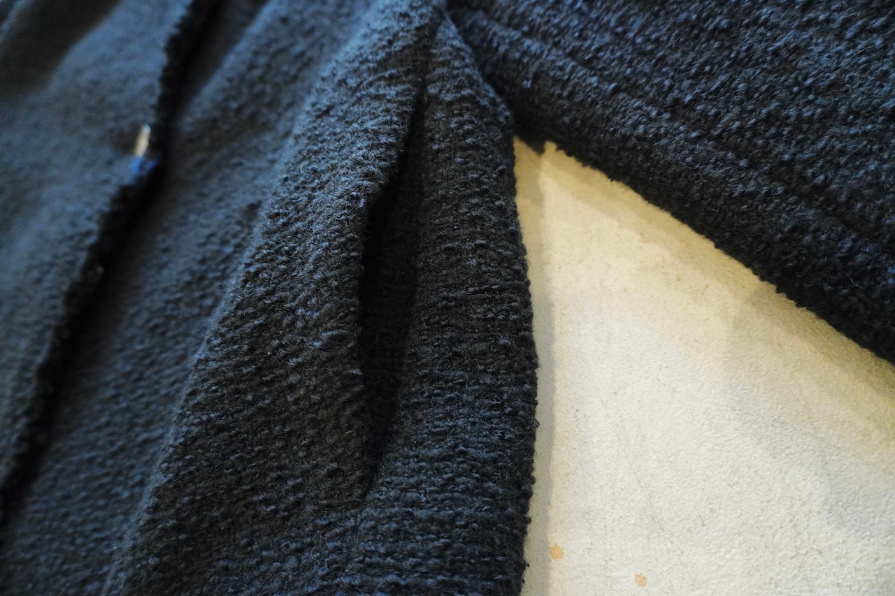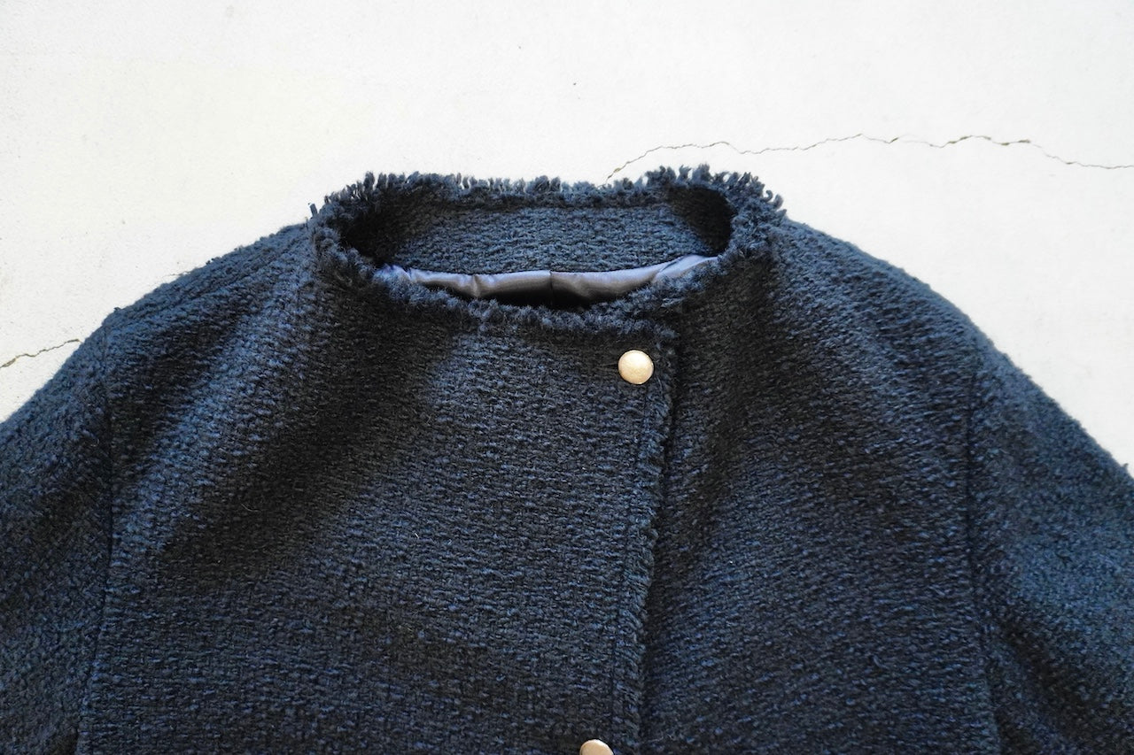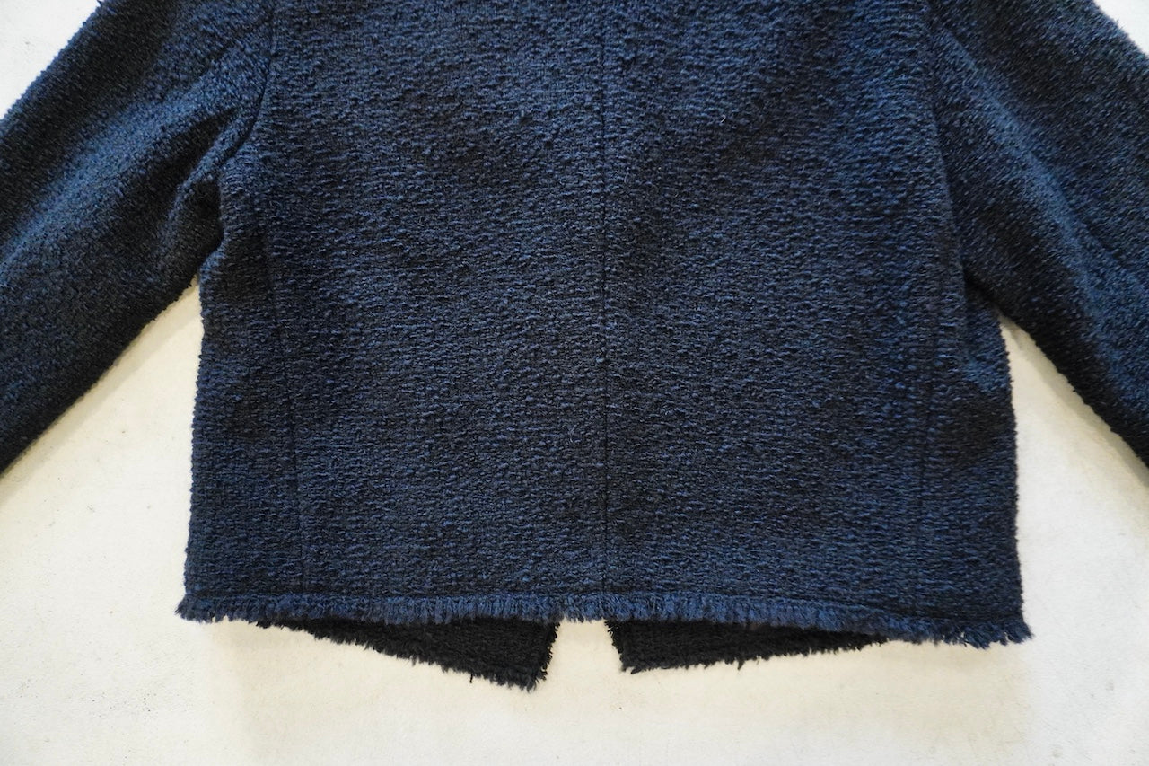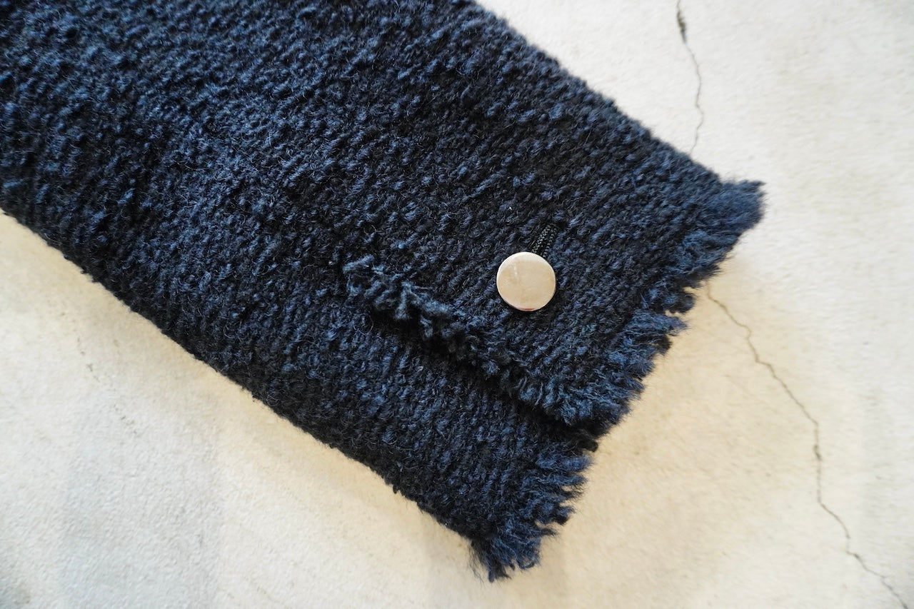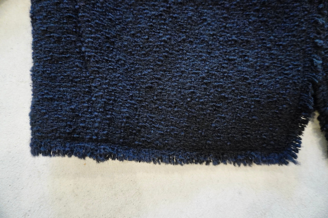イタリアのプラトーのメーカーで、経糸にウール糸、緯糸にウール、ナイロン、シルク糸でざっく織りあげた糸味を生かした素材です。フリンジワークが効いたフォルムジャケット。